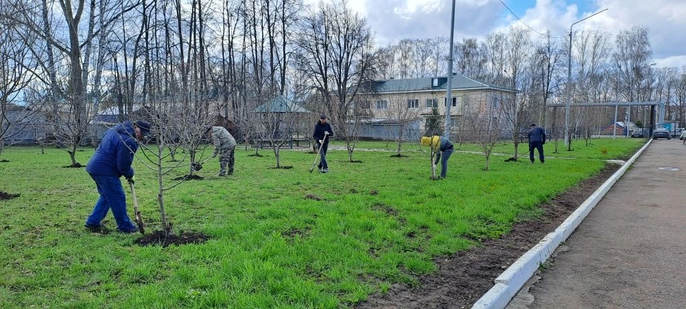 Коллектив высадил деревья, подготовил газоны для будущих цветов и побелил бордюры. Все вместе мы навели порядок на территории учреждения.